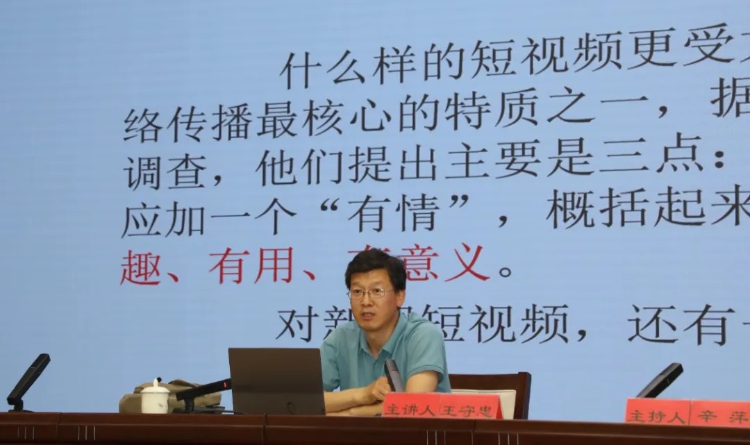 在两个小时的讲座中,王守忠结合当下时事热点与自身工作实践,通过生动的视频制作案例和实践操作,和大家交流分享了短视频创作的技巧和方法,帮助大家全面了解短视频创作的全过程,为师生们的短视频创作提出了具体建议与思路,希望今后,大家能创作出更多紧跟时代发展、符合学校需要、师生喜闻乐见的新媒体产品和短视频内容。