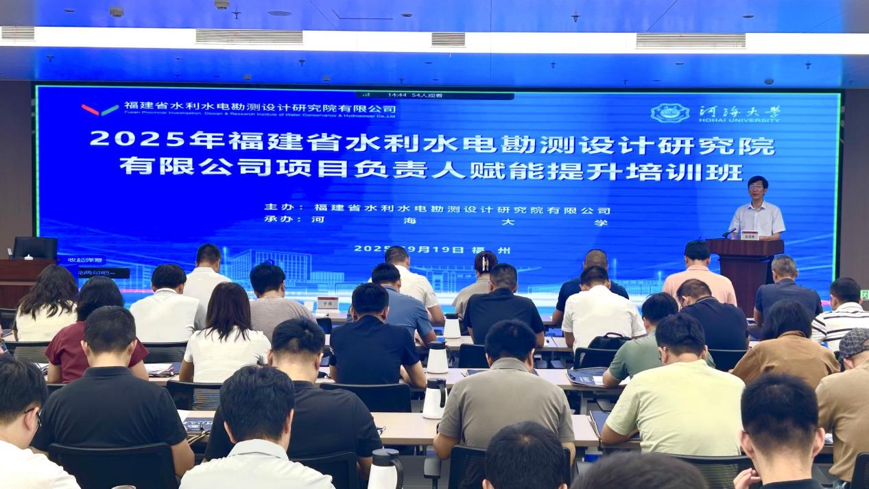9月19日上午,福建省水利水电勘测设计研究院有限公司项目负责人赋能提升培训班在福州顺利开班。mg4355电子官网主页副院长于伟,福建省水利水电勘测设计研究院有限公司经营发展部主任吴全喜、技术质量部主任张裕平、人力资源部主任赖琤、经营发展部副主任郑瑄琳出席开班仪式。